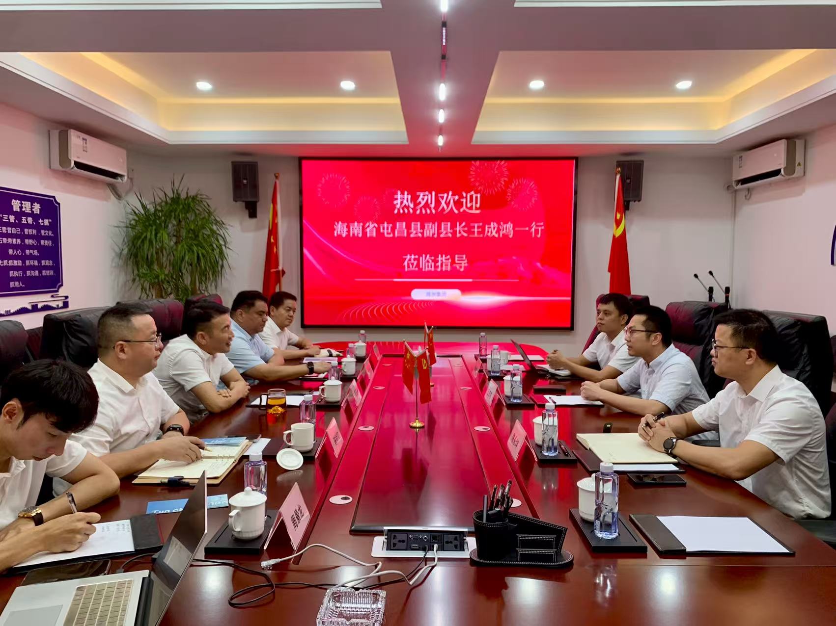8月21下午,海南省屯昌县副县长王成鸿、县发展控股有限公司总经理陈永坤、县招商专班项目组组员温泽芳莅临昶海投资(集团)有限公司考察。集团董事长周昌海、党支部书记袁海峰、副总裁陈尚文热情接待并深入交流。